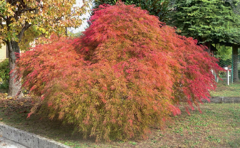 Très vigoureux, port en globe avec les branches externes retombantes .Feuillage rouge orangé intense, souvent jaune orangé à l'automne.